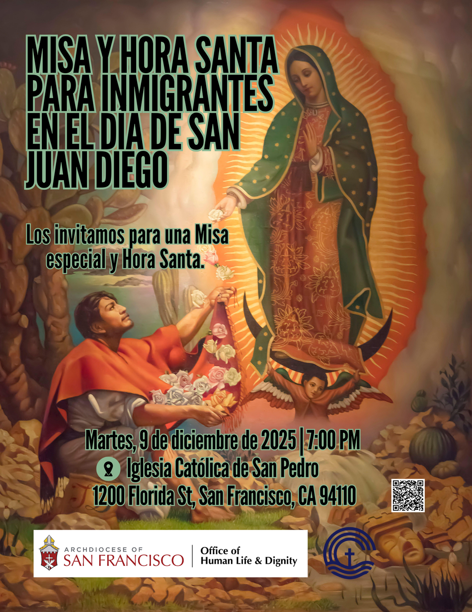 Únase a nosotros en la Novena a Nuestra Señora de Guadalupe, que comienza el viernes 28 de noviembre y culmina con la peregrinación a Nuestra Señora de Guadalupe y la Misa en la Catedral de Santa María de la Asunción el 6 de diciembre. La imagen itinerante es una réplica a tamaño natural de la tilma original. Esta réplica fue presentada al Arzobispo Cordileone durante su reciente viaje a México. La imagen es una reliquia de tercera clase, ya que fue tocada junto a la tilma original en la Basílica de Nuestra Señora de Guadalupe en la Ciudad de México. ¡Acompáñenos en oración y celebración de Nuestra Señora de Guadalupe mientras la tilma viaja a un lugar cercano a usted en los tres condados de la arquidiócesis!