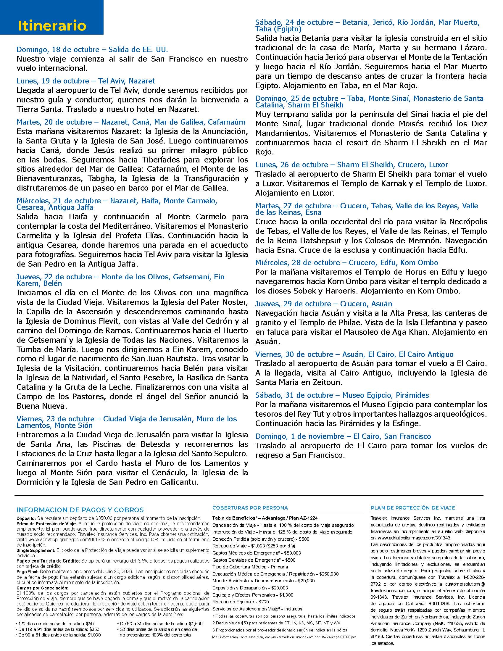 NAZARET-CANA-MAR DE GALILEA-CAFARNAUM-HAIFA-MONTE CARMELO-MONTE DE LOS OLIVOS-GETSEMANÍ-KAREN-BELÉN-CIUDAD VIEJA DE JERUSALEM-MURO DE LOS LAMENTOS-MONTE BETANIA-RÍO JORDAN-MONTE SINAI-SHARM EL SHEIKH.